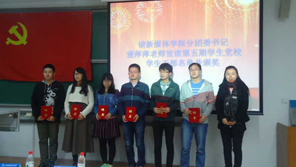 党委李建伟副书记宣读第四期共建党校优秀学员名单并进行了颁奖。优秀学员代表上一届党校的中坚力量进行了发言,指出只要一心向党,认真学习,就一定能提高意识,向党靠拢。然后,新媒体艺术与设计学院分团委书记董萍萍老师宣读了第五期共建党校学生干部名单并颁发聘书。最后,新学员代表进行了发言,在主持人的结束辞中,第五期共建党校开学典礼顺利结束。