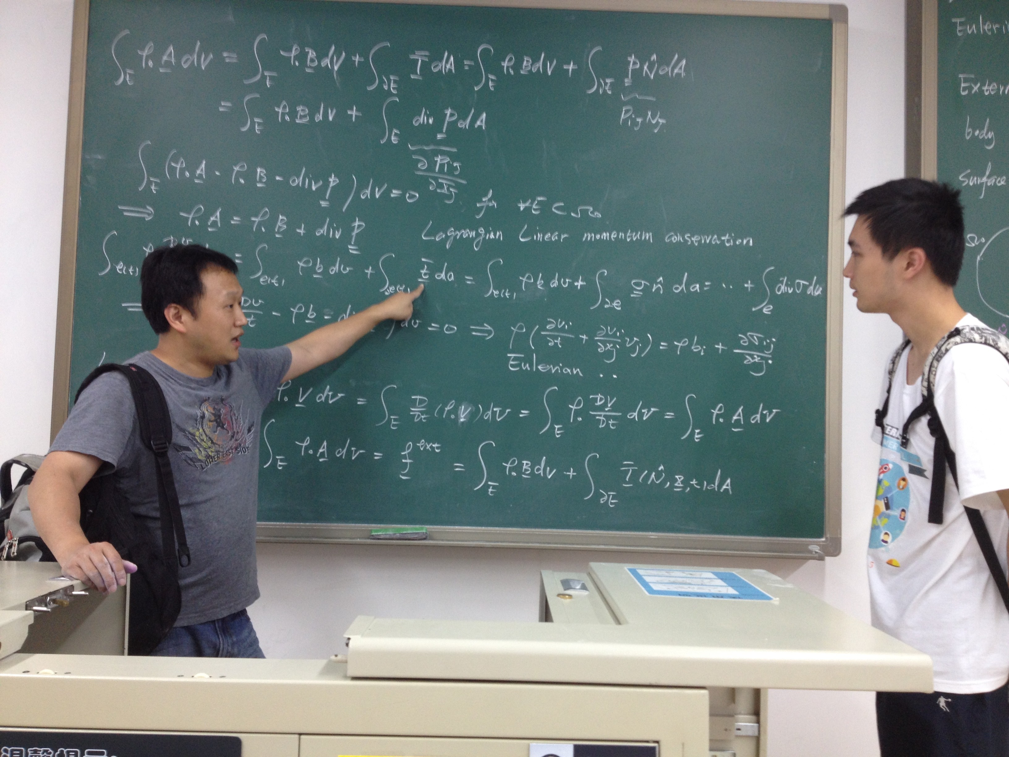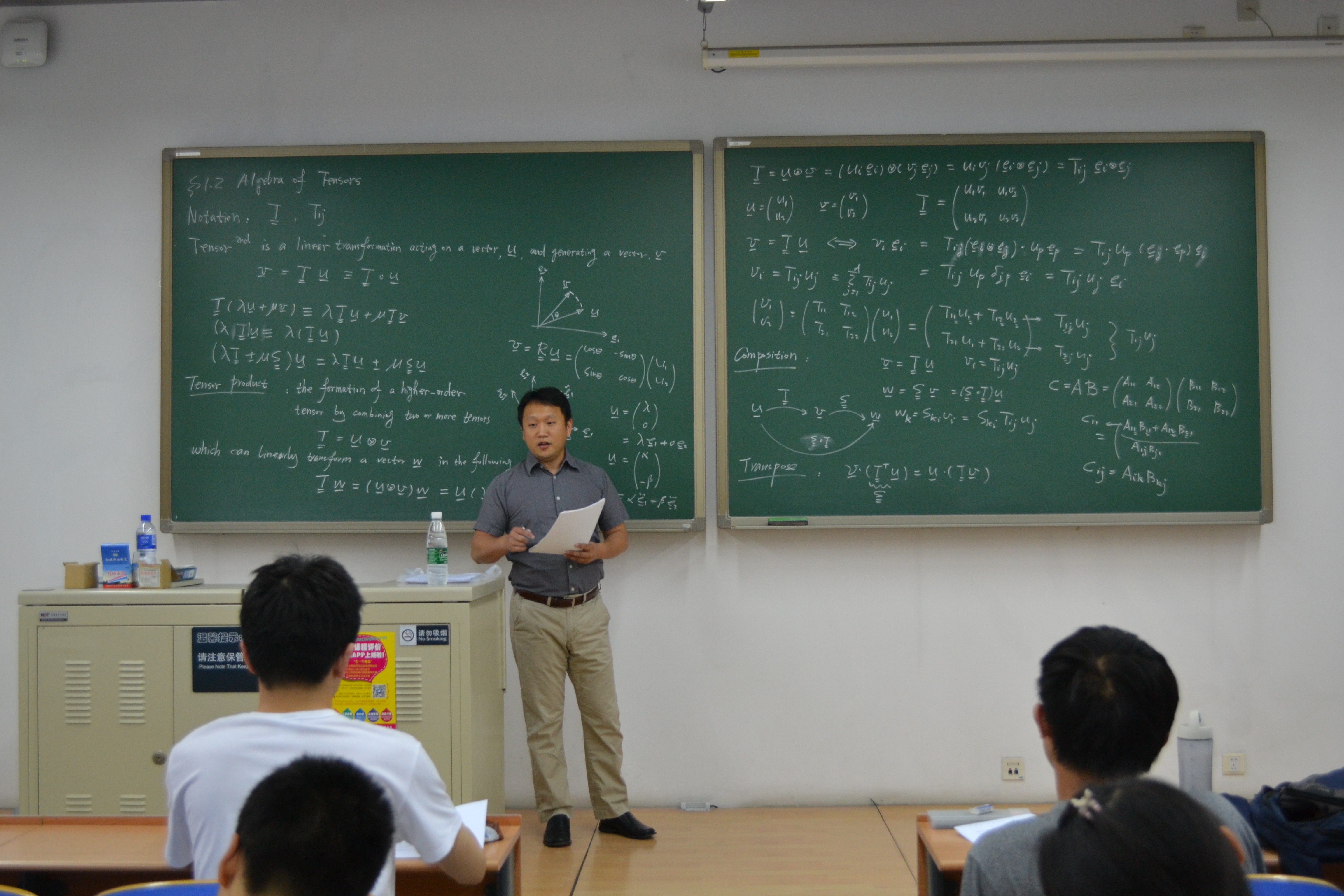 在我校访问期间,Li教授开设的“连续介质力学”引智课程,吸引了我院本科生和研究生的积极参与。Li教授采用他在凯斯西储大学授课的原版讲义,将课程内容分为4部分,首先介绍了向量和张量,并针对同学们不太熟悉的张量做了详细的解说;接着为同学们详细介绍了变形体的运动形式;然后从质量守恒、动量守恒和能量守恒三个方面向同学们讲解了连续介质力学中的守恒定理;最后对本构关系进行了介绍。