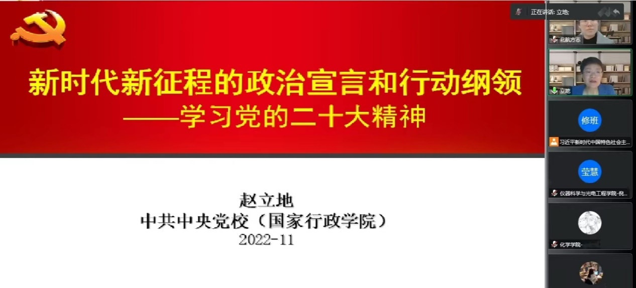 11月20日上午9时,研修班邀请了中央党校(国家行政学院)哲学教研部党总支专职副书记赵立地作题为《新时代新征程的政治宣言和行动纲领——学习党的二十大精神》的主题报告。春满四合院