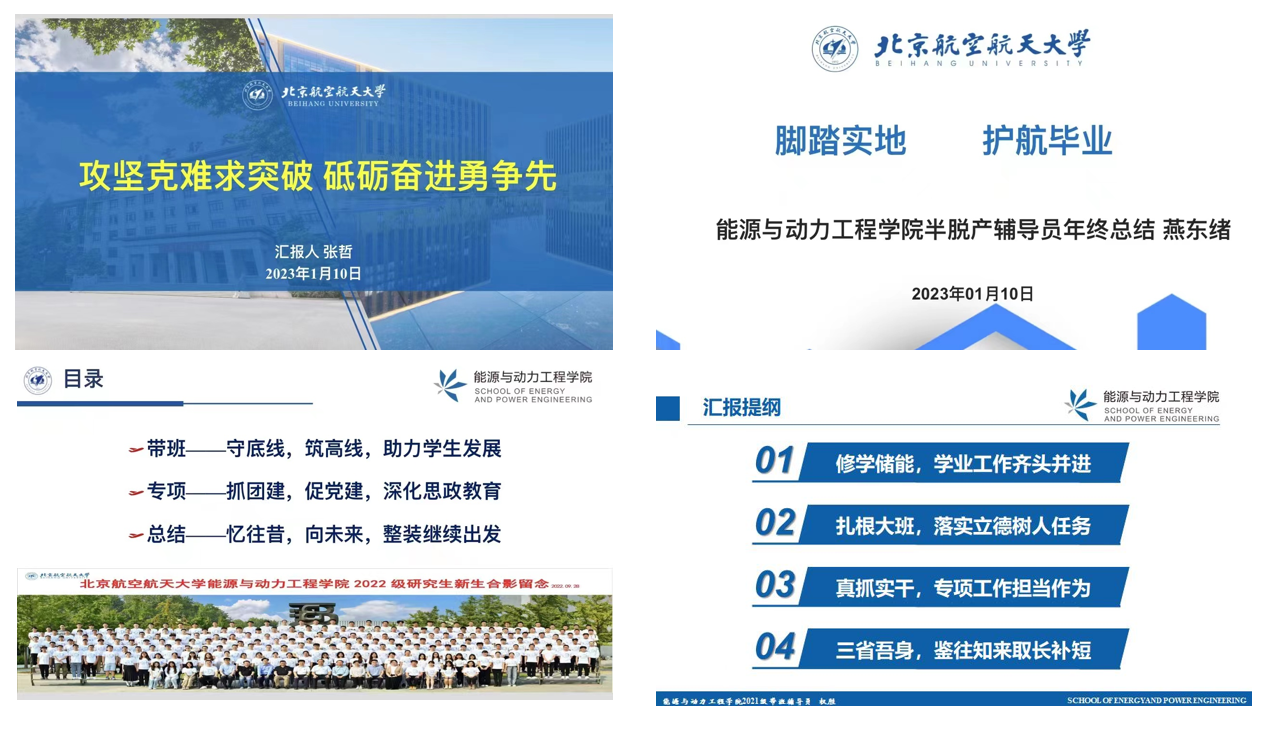 党委副书记方志、分团委书记李天韵、专职辅导员程乾、刘亦泽以及全体辅导员开展总结、批评与自我批评、整改与新学年计划研讨。根据年初制定的目标计划,大家围绕党建宣传工作、理想信念教育、心理健康教育、创新创业实践、学风建设、团队建设、制度机制等方面梳理了2022年的工作情况,从完成程度、质量特色、不足之处三方面进行总结,分享了个人经验与成长收获,进行了批评与自我批评,对2023年工作进行了展望和计划。在每位辅导员总结和自我批评之后,其他与会人员发表看法,同时集体对共性问题进行研讨。大家互相学习、共同进步。