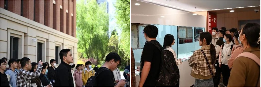 双方在厚道石前合影后,由北医同志带领参观了美丽的校园,欣赏北医优美的风景,校园内植物与建筑融合在一起,氛围和谐轻松。从校园门口的厚道石,再到北大医学科技楼、解剖楼,最后到图书馆的“厚道行医——北大医学办学110周年特展”以及逸夫楼的百年北医历程展,北医同志耐心的讲解不仅让我们看到了医学界陆先生等前辈们的刻苦努力,为我国医学发展做出卓越贡献,还认识到遗体用于科研的大体老师,他们的无私精神感动着一批又一批的学子,是真正的无言良师。时代洪流的发展带动着科学的前进,每个医学人的努力奋斗也在助力中国医学向着世界医科的高峰攀登。