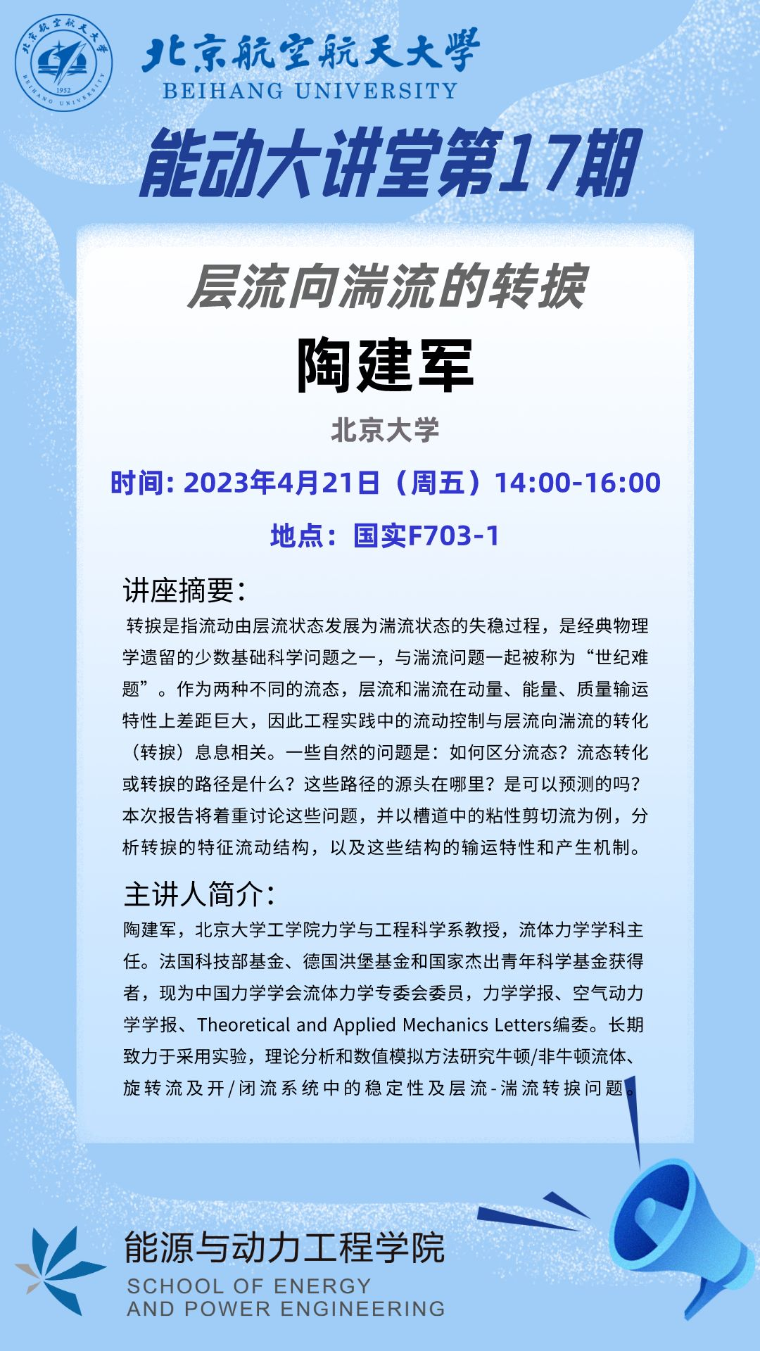 特别举办高端学术论坛,邀请北京大学陶建军教授开展以“层流向湍流的转捩”为主题的学术讲座,与同学们共同探讨转捩难题。