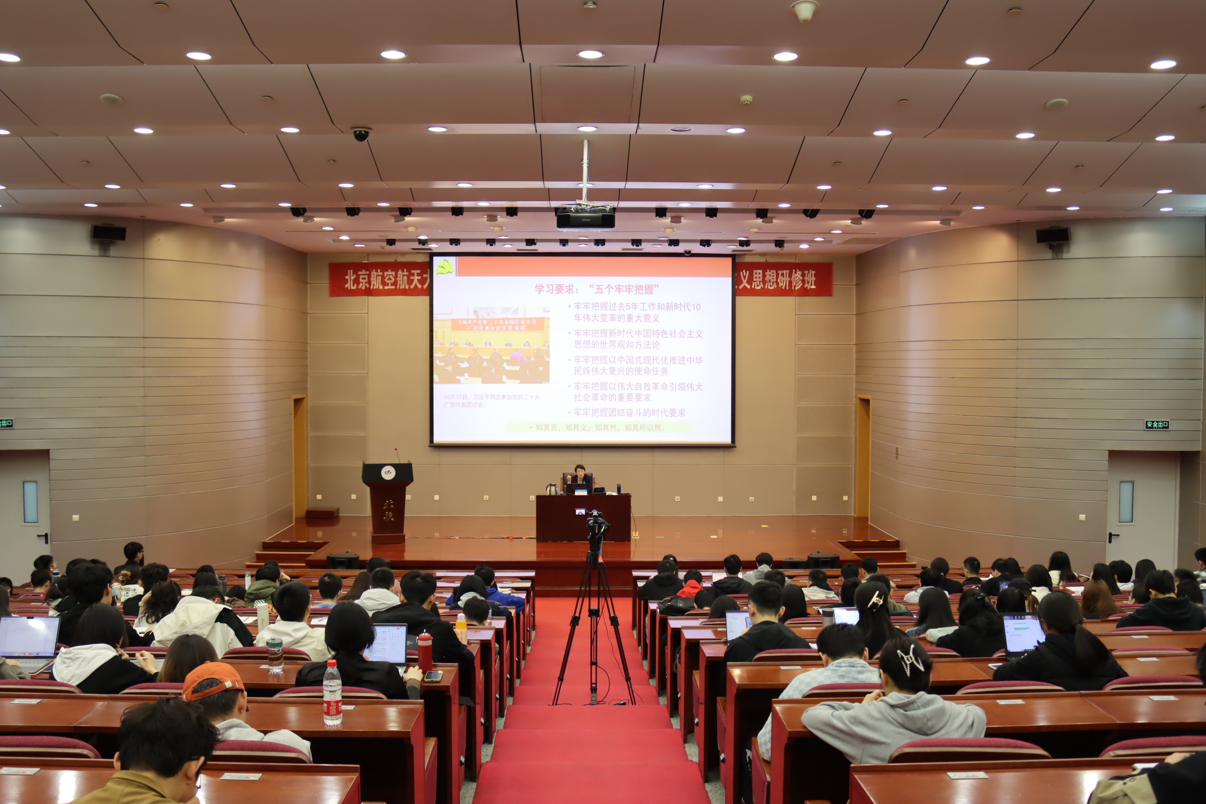 4月22日,研修班进行第一次理论学习,此次学习研修班邀请了中央党校(国家行政学院)哲学教研部党总支书记赵立地作《新时代新征程的政治宣言和行动纲领——学习党的二十大精神主题报告》。上午九时三十分,研修班理论学习在两个校区、三个会场同步开始,全校30个学院100余名专兼职辅导员、450余名新发展学生党员参加学习,春满四合院