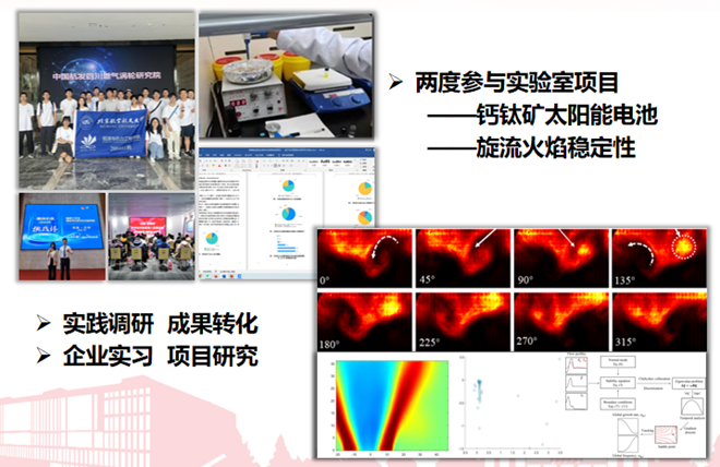 只问耕耘,丰盛自来。为进一步培养学术思维和科研能力,他深入科技实践,参与钙钛矿太阳能电池、旋流火焰稳定性等项目研究,获得冯如杯主赛道三等奖、动力杯二等奖等荣誉。