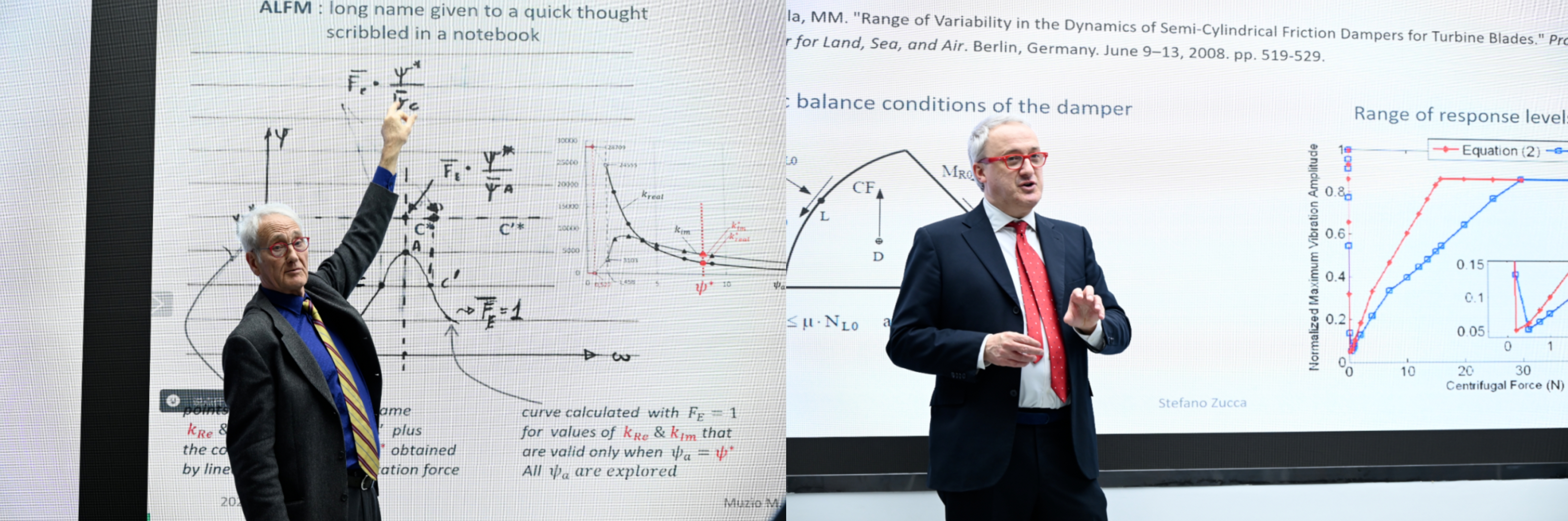 Zucca教授做了题为“Dynamic response variability of a turbine blade with frictional dampers”的学术报告,从理论、仿真和试验上阐释了干摩擦系统动力学多解现象的产生机制。这种多解现象在实验上体现为稳态扫频实验在升、降频率实验时获得不同频响曲线的现象。Zucca教授的工作认为,这是由于干摩擦界面在静摩擦力的取值本来就不唯一,再加上缘板阻尼器一侧切向力与另一侧正压力天然具有耦合,这就将静摩擦力的不唯一引至了正压力的不唯一。而正压力是影响阻尼效果的关键参数,它的不唯一必将导致频响曲线和阻尼性能的不唯一(多解)。这一工作深刻揭示了缘板阻尼器所特有的非线性特性的产生机理,对试验台的设计和算法的开发提出了诸多指导性意见。
