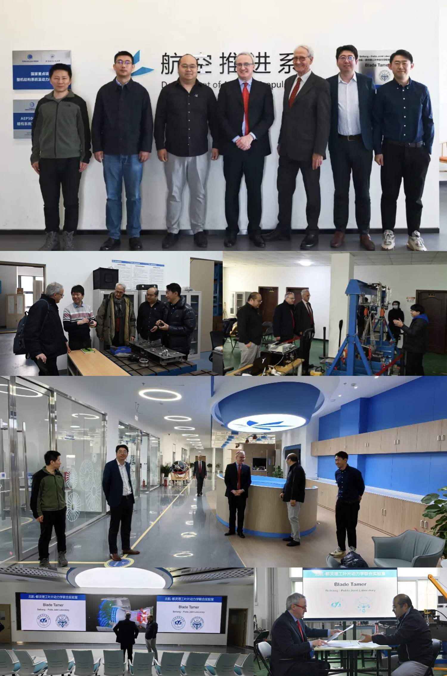 的整体情况进行了简要介绍。两位教授充分了解了各实验室的研究方向和研究内容,亲身体验了航空发动机的虚拟装配,参观了含连接结构转子动力学特性、金属橡胶力学特性、含压电阻尼支点转子动力学特性、多级叶盘动力学特性与减振、螺栓松动健康监测、周期结构动力学特性、干摩擦界面特性、叶片干摩擦动力学特性等十余个实验台,并就自己感兴趣的试验器与师生进行了充分交流。随后,双方签署了北航-都灵理工叶片动力学联合实验室合作协议,共同为联合实验室揭牌,并对未来双方共同推动前沿性研究表达了美好期望。
