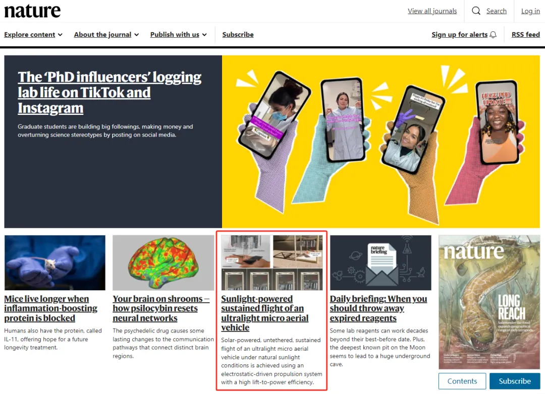 在本成果之前,此领域的最高水平成果是哈佛大学2019年在Nature发表的Robobee飞行器,但仍需采用人工光源(三倍太阳光)才能实现持续飞行,而本成果仅依靠自然光即可实现持续飞行,可极大拓展此类飞行器的使用范围,在微型飞行器的发展进程中具有里程碑意义。