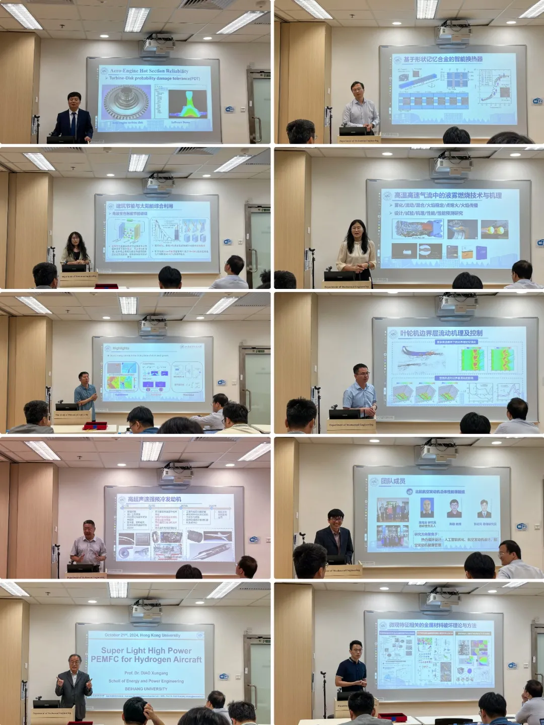协议签署后,双方围绕清洁能源与绿色动力主题开展双边研讨会(HKU-BUAA Bilateral Seminar and Academic communication on Green Energy and Power)。双边研讨会由香港大学罗昭君老师主持,会议立足于能源与动力学科基础科学问题,面向国际学术前沿,涉及先进结构材料、智能飞行器与机器人、能源与燃烧科学、流体力学与噪声控制等多个学科方向。双方与会人员共做近20个高水平的学术报告,并就相关热点科学和工程问题展开了热烈地讨论,增进了双方的互相了解,极大地促进了双方在相关学科的交叉互补,为未来深入开展合作研究及原始创新打下了良好基础。