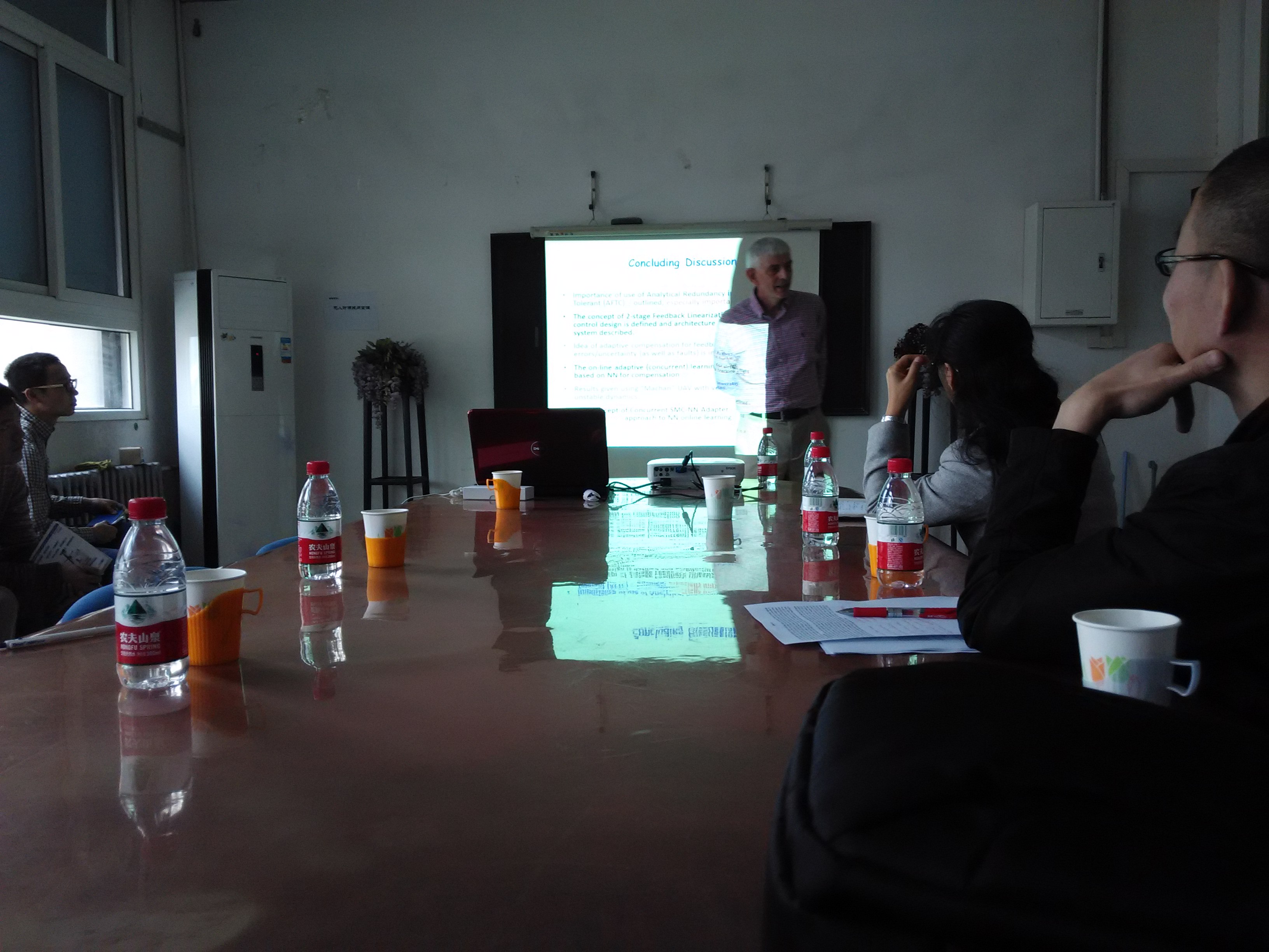 Ron J. Patton教授毕业于英国谢菲尔德大学,是故障诊断与容错控制领域的世界级权威专家,曾担任国际自动控制联盟(IFAC)技术过程安全性与监督委员会(Technical Committee on Safety & Supervision of Technical Process)主席,现任教于英国赫尔大学科学与工程学院,是IEEE Fellow,the Institute of Measurement and Control Fellow,AIAA senior member,曾主持多项欧盟科研项目,包括与英国罗罗公司和美国NASA合作开展的发动机控制与故障诊断研究。目前,Patton教授已发表348篇学术论文,其中包括114篇期刊论文,并已出版6部学术著作。在当天的报告会上,Patton教授以《Reconfigurable Flight Fault Tolerant Control for Nonlinear Unmanned Aerial Vehicle》为题,作了1个多小时的学术报告,内容涵盖了容错控制在无人机中的应用问题,报告内容深入浅出,在场的师生认真听取了报告会,并积极地与Patton教授进行了关于基于神经网络补偿的容错控制问题的交流。